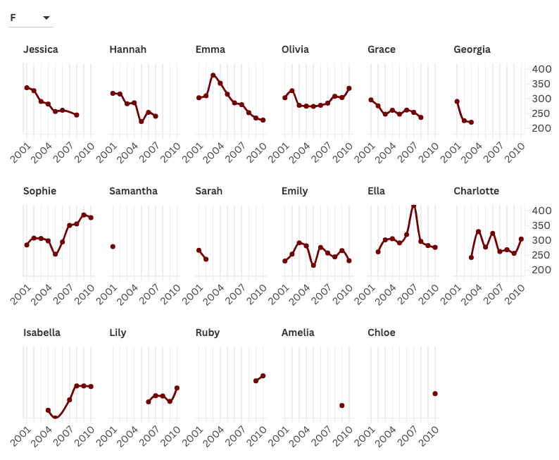 I really like the simplicity of your display and how each chart is only for one name because it allows the reader to immediately understand what is happening. I like how for each name you can see the pattern over the years and due to it’s simplicity, I believe that absolutely anyone could look at the graphs and understand what is being displayed.