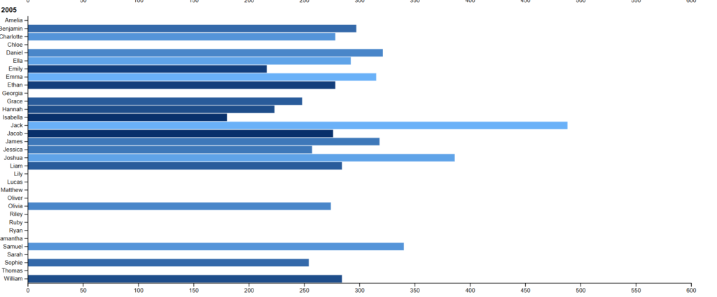 I had some issues with creating my graph. First off, I couldn’t figure out how to separate the names by gender so as a result all of the names are grouped together in the same graphs. I think that this grouping altered the way in which someone would interperate the graphs because in the original data set it wasn’t comparing boy and girl names together. I think that if it were to compare boy and girls names together or, in other words, names in general the numbers would look quite different. I also had issues with keeping the years in the same graph wihtout it looking too clutered so I ended up creating seperate graphs for each year. Above I took a screenshot of 3 of the graphs to show the disparities.